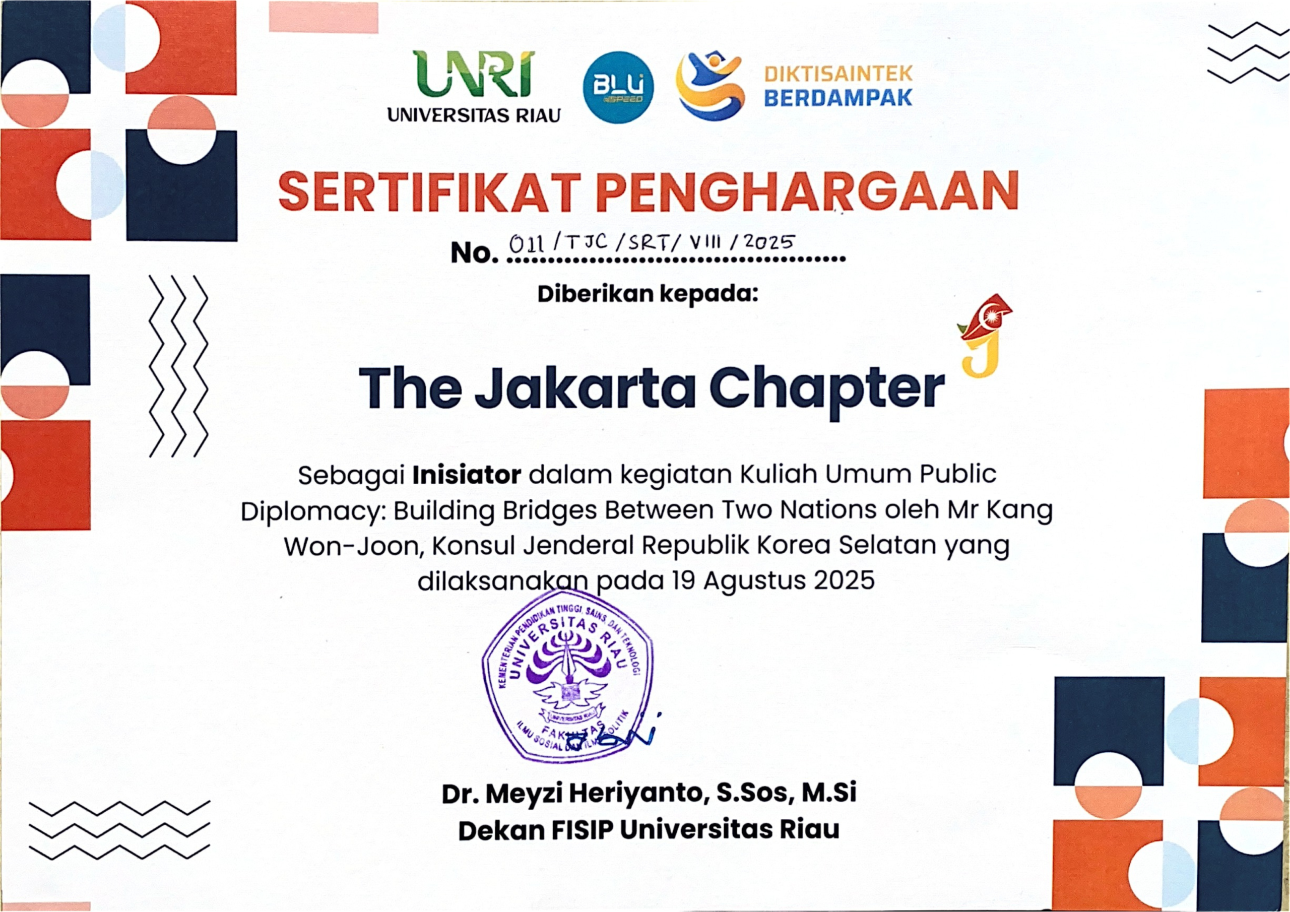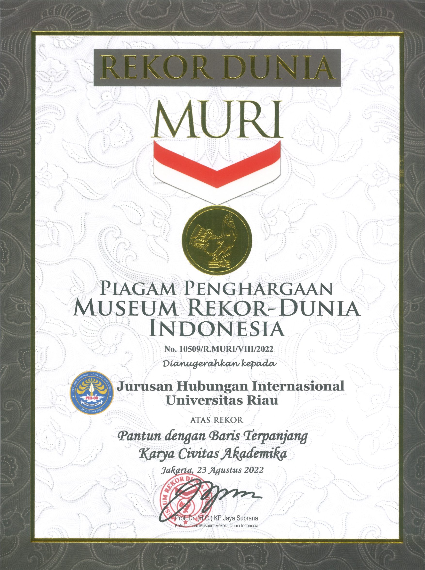 Acknowledgement Certificate of Appreciation from Governor of Riau Certificate of Appreciation from FISIP Universitas Riau MURI Award for Pantun World Record Certificate of Appreciation from Governor of Riau Certificate of Appreciation from FISIP Universitas Riau MURI Award for Pantun World Record
